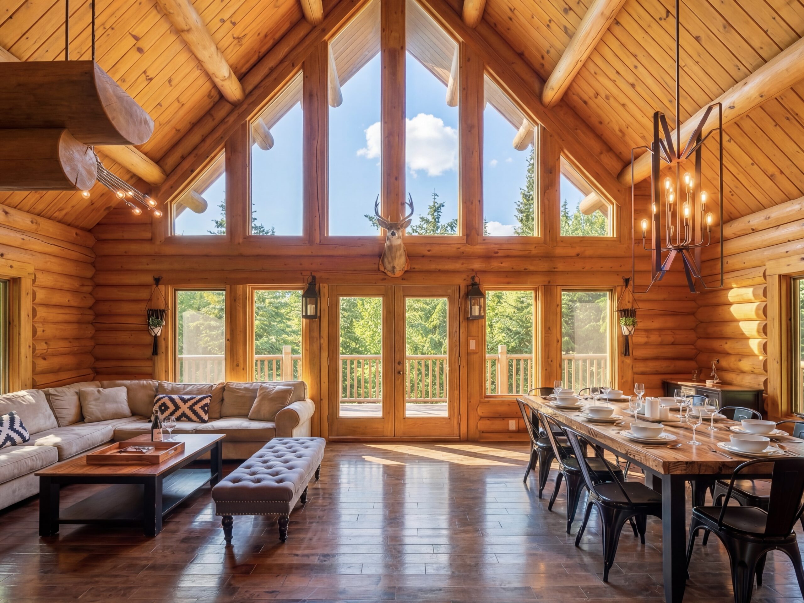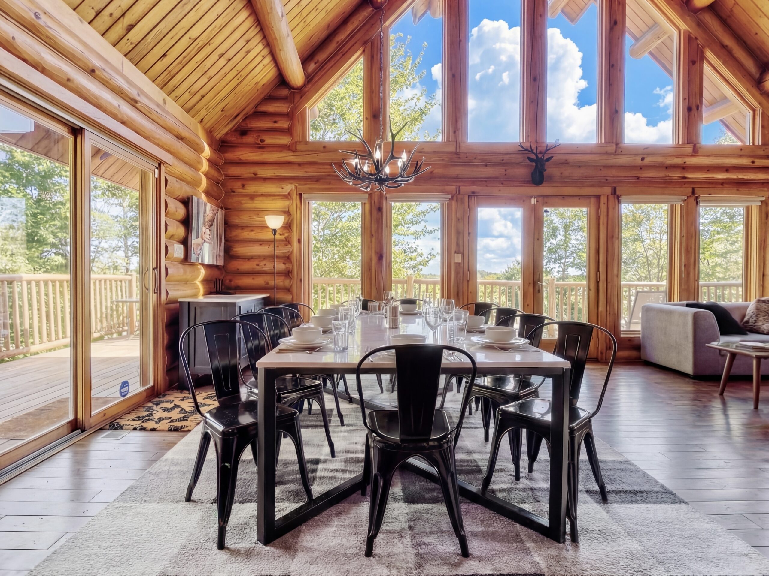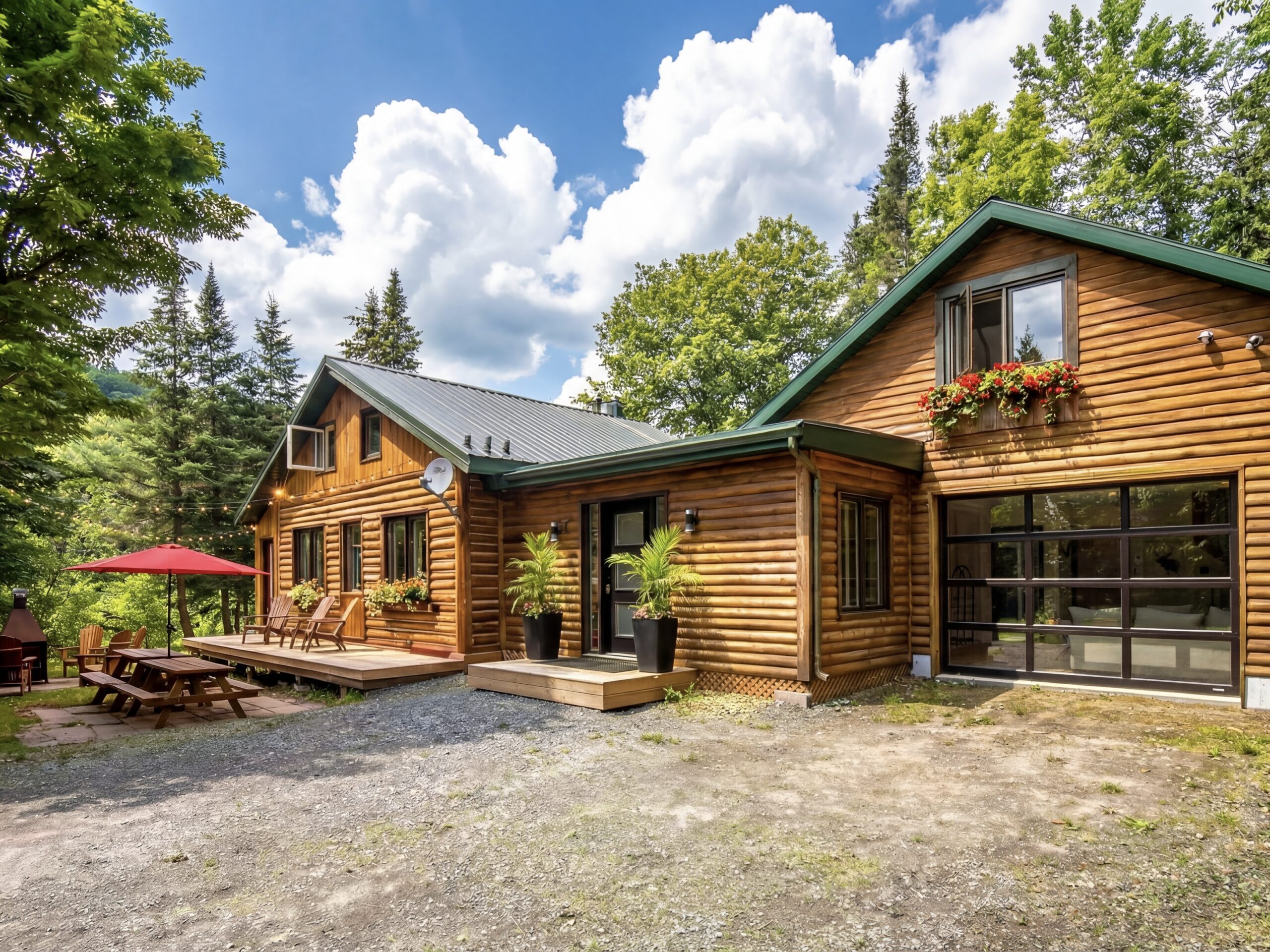 Escape to a stunning Canadian log cabin just 25 minutes from Mont-Tremblant, featuring year-round outdoor spa, 21-ft cathedral ceiling.