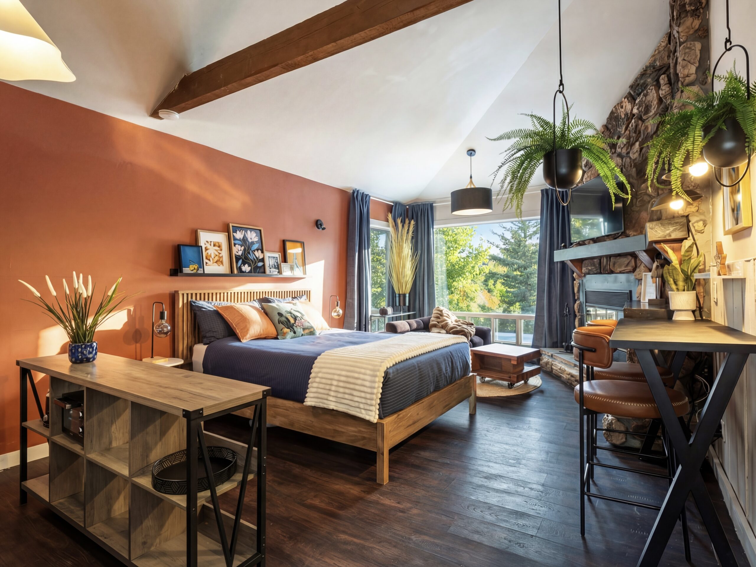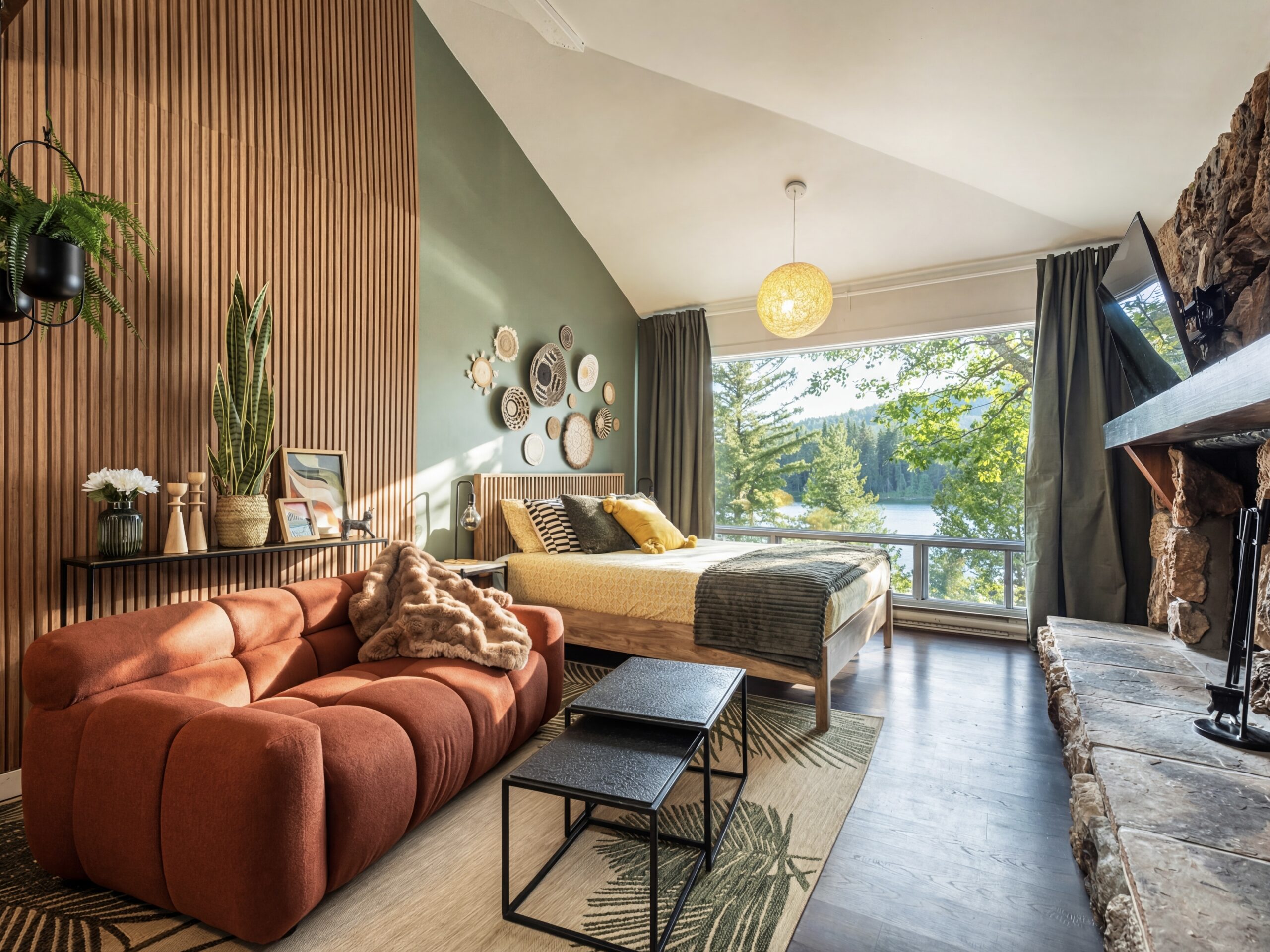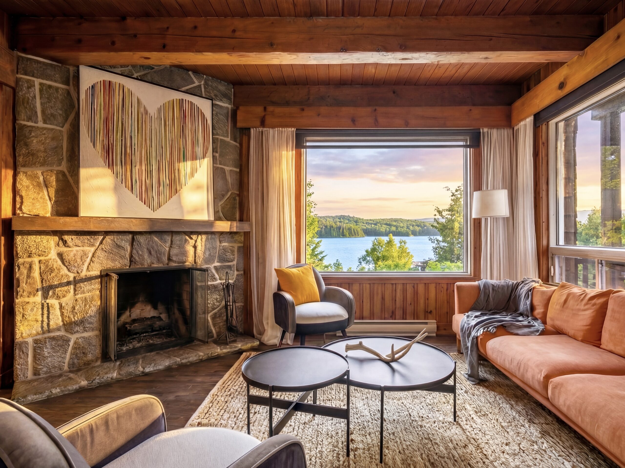 Escape to ROSA, a romantic lakefront loft with a private spa, indoor & outdoor fireplaces, and breathtaking views of Lake Sarrazin.