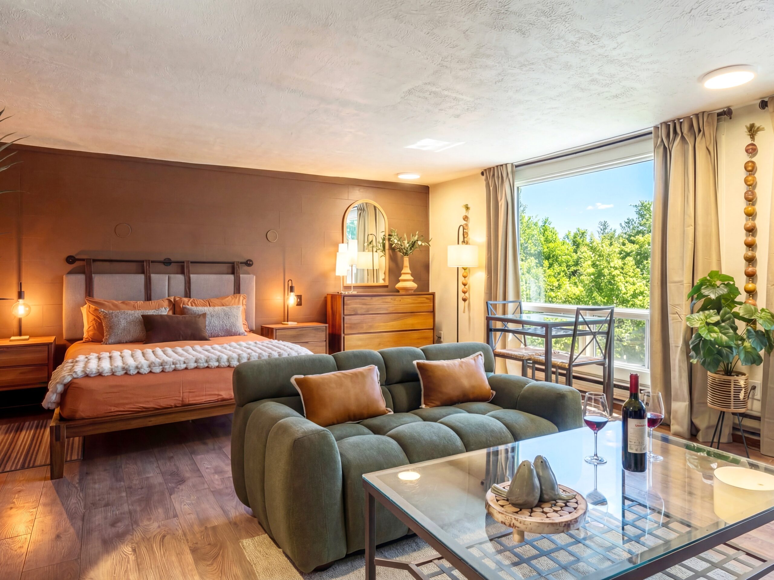 Le LUNA in Mont-Tremblant is a romantic couples’ retreat featuring a private year-round outdoor spa, cozy studio layout, and scenic mountain views.